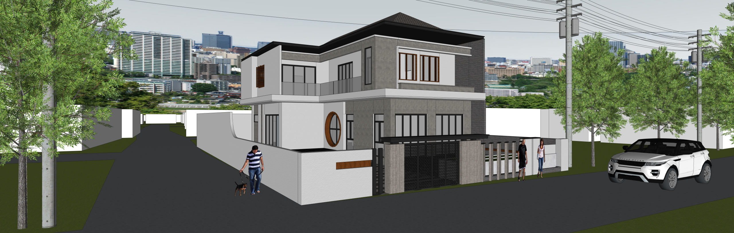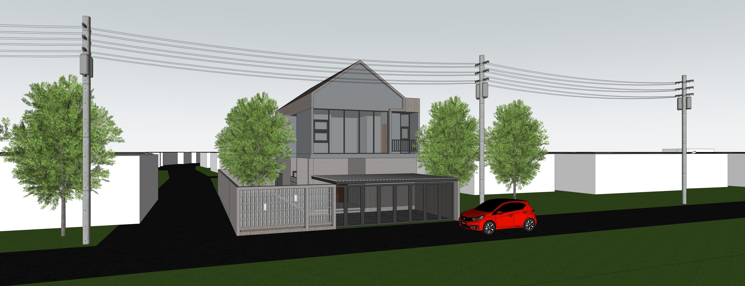 Hasil karya peserta berupa desain 3D rumah modern minimalis dua lantai seperti pada gambar, menampilkan komposisi bangunan yang proporsional dengan detail arsitektur yang menarik. Elemen-elemen seperti jendela besar, pagar minimalis, dan penggunaan warna netral memperkuat kesan modern dan elegan. Lingkungan sekitar juga dibuat realistis dengan penambahan pepohonan, kendaraan, dan latar kota.